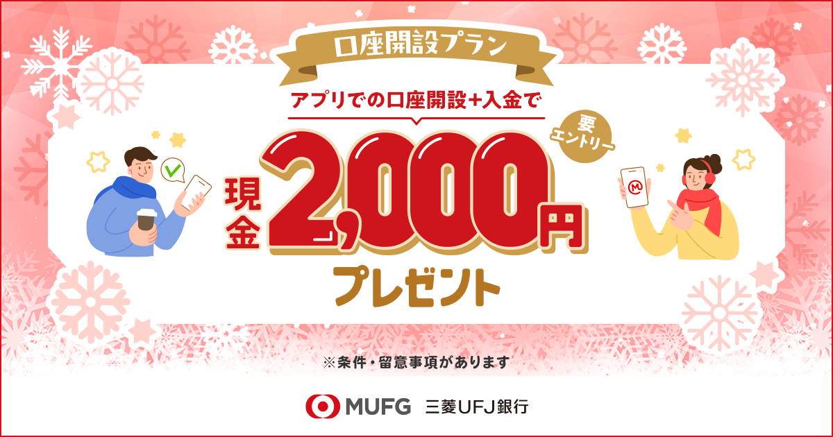 無料送金・無料出金という利便性に加え、三菱UFJ銀行が提供する「新規口座開設キャンペーン」(現金プレゼントなど)も活用できるチャンスがあります。現在は最大2万円もらえるキャンペーンが開催中!